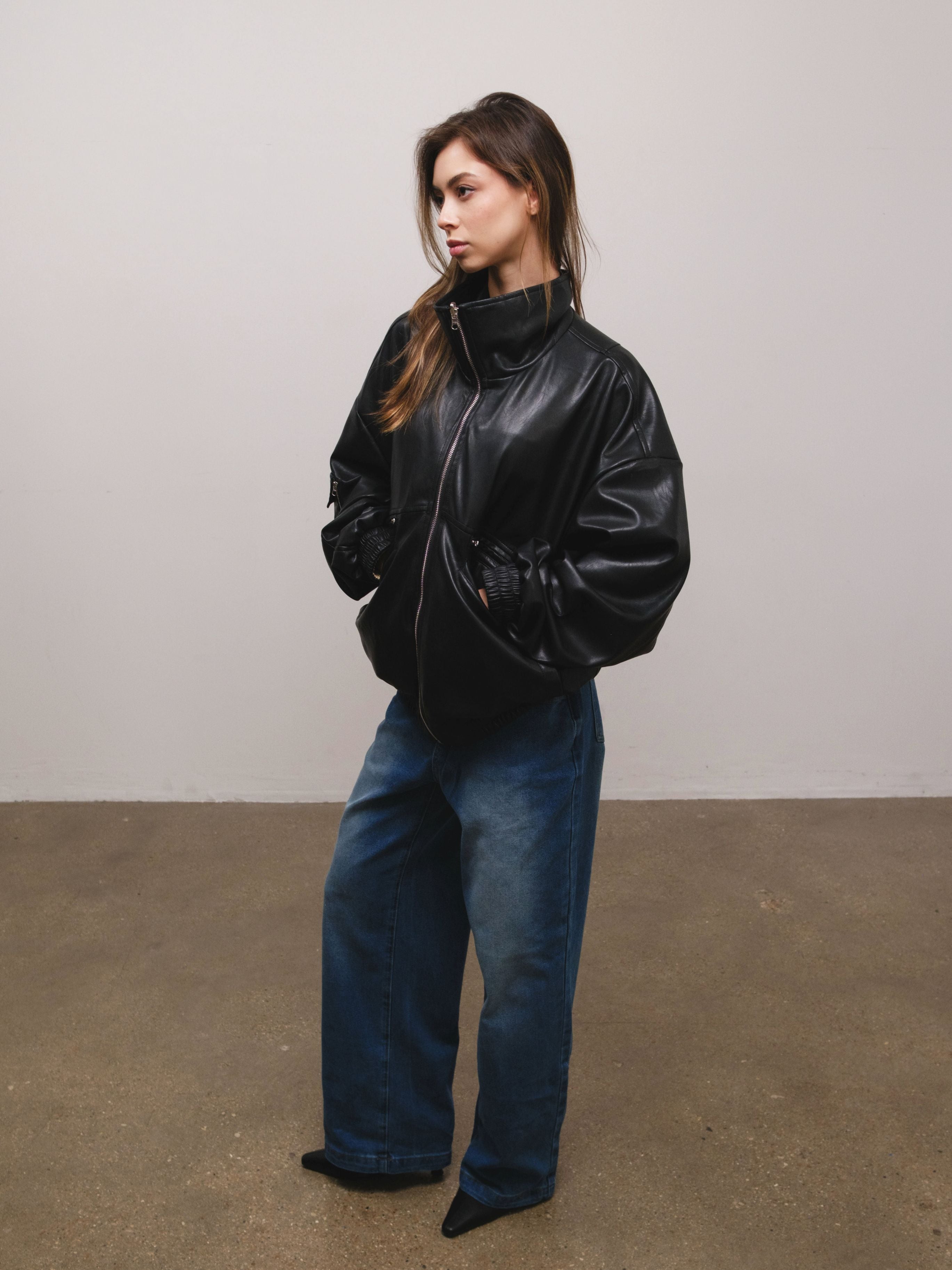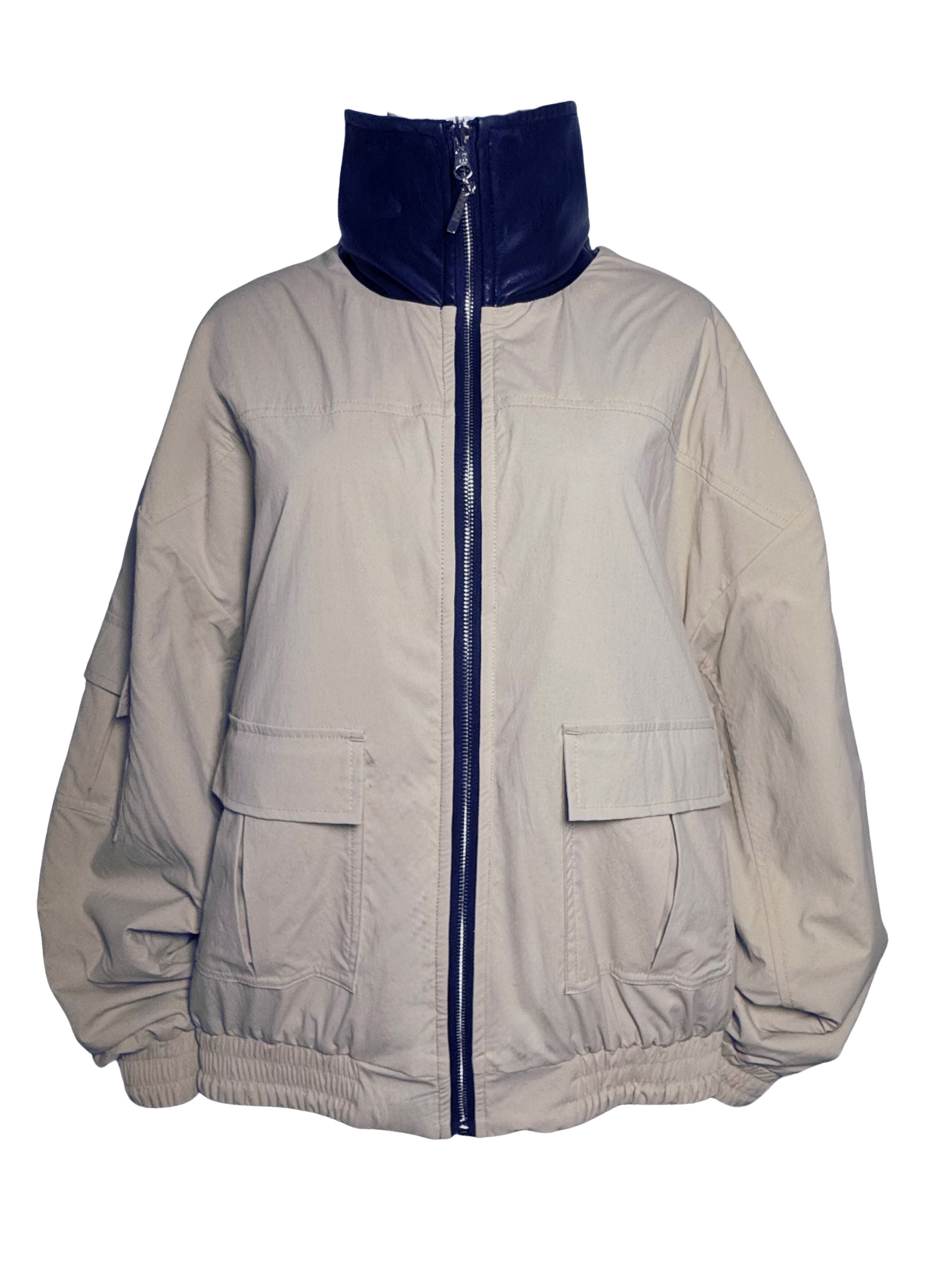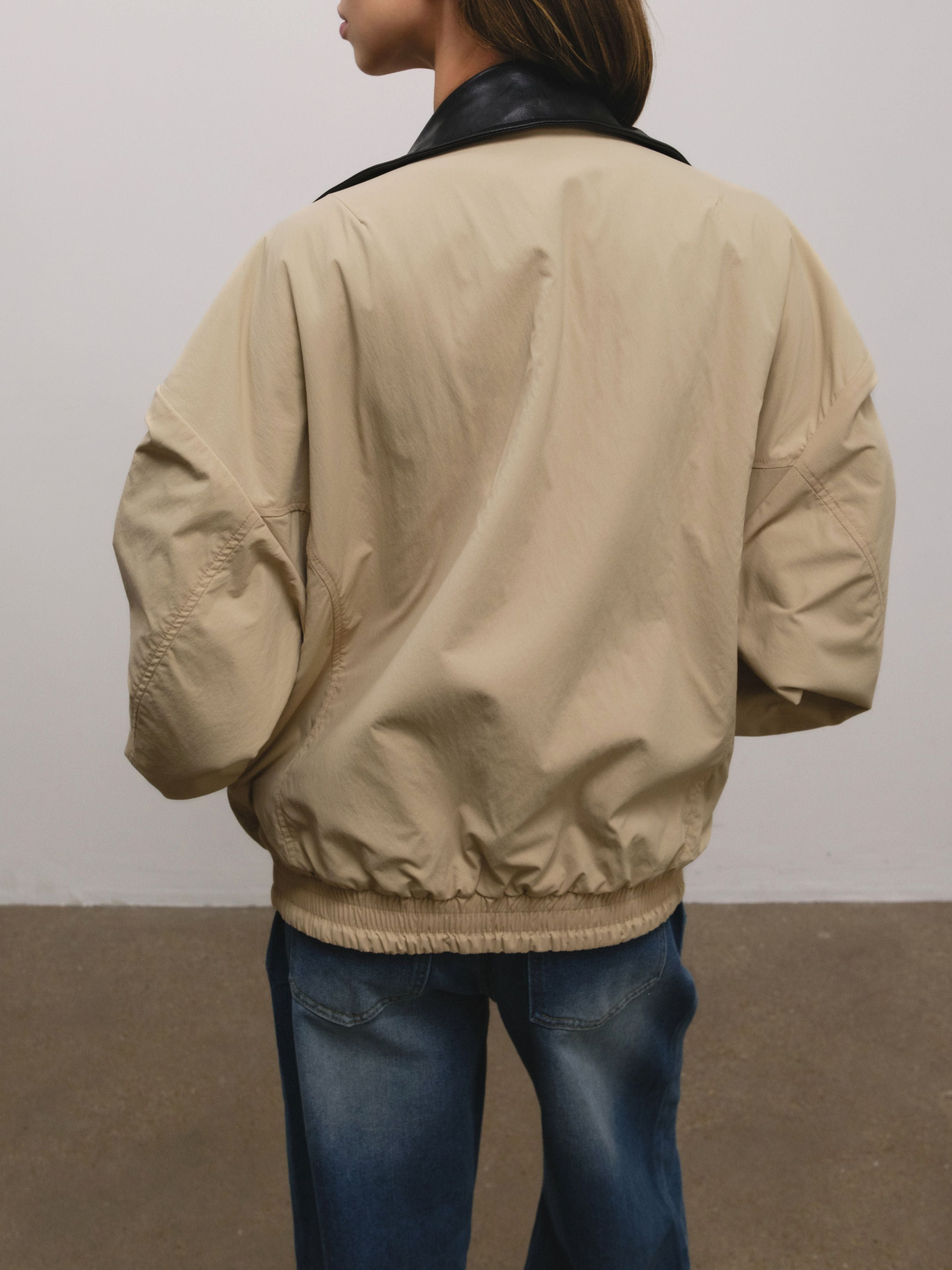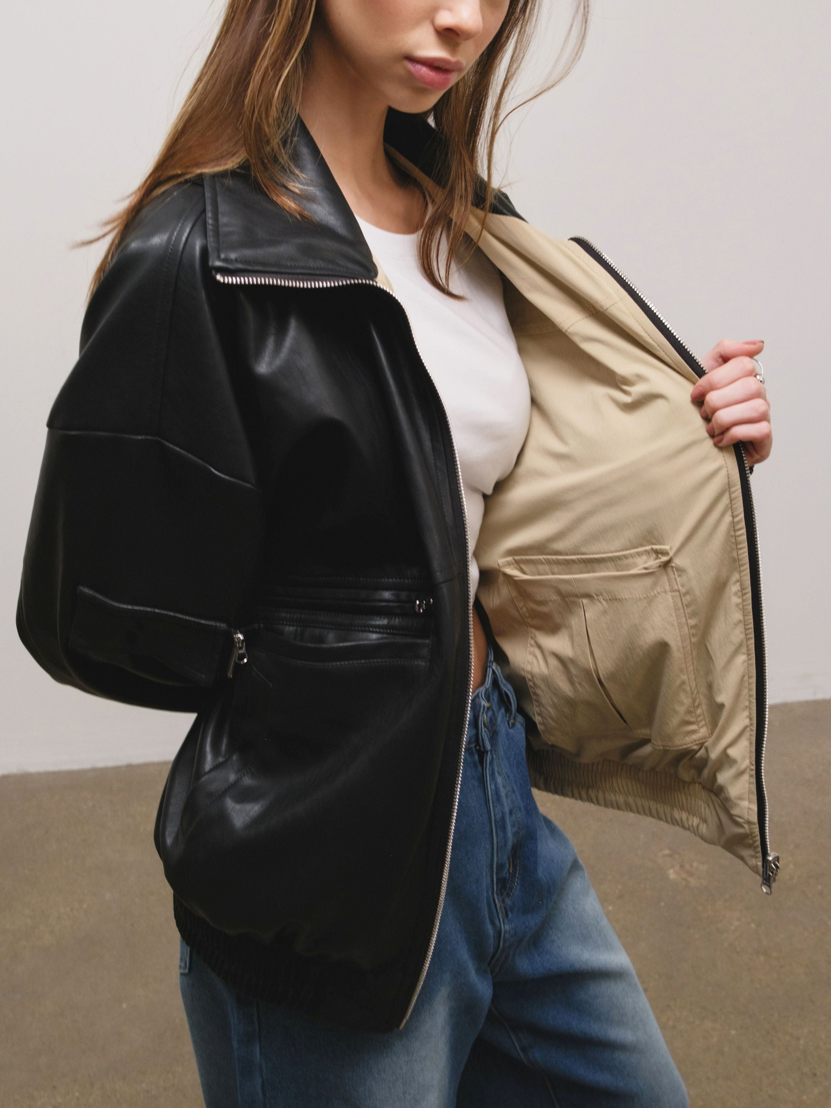 A reversible faux leather and nylon jacket designed to shift with you. One side offers a soft-touch faux leather for a bold, structured look; the reverse reveals sleek nylon for a softer, effortless feel. Both sides are finished with an adjustable funnel neck that styles high, relaxed, or undone—transforming with your mood and your moment.