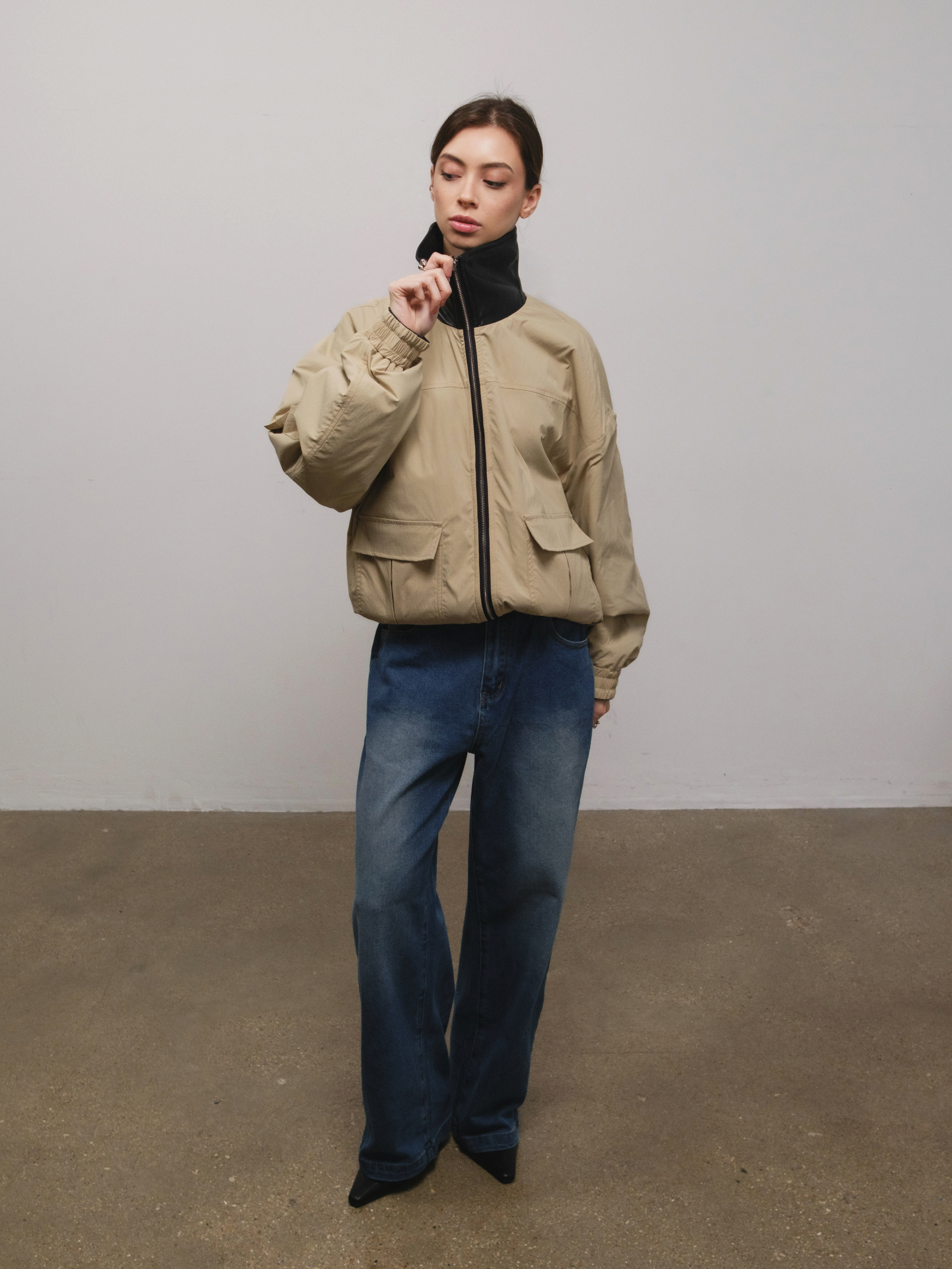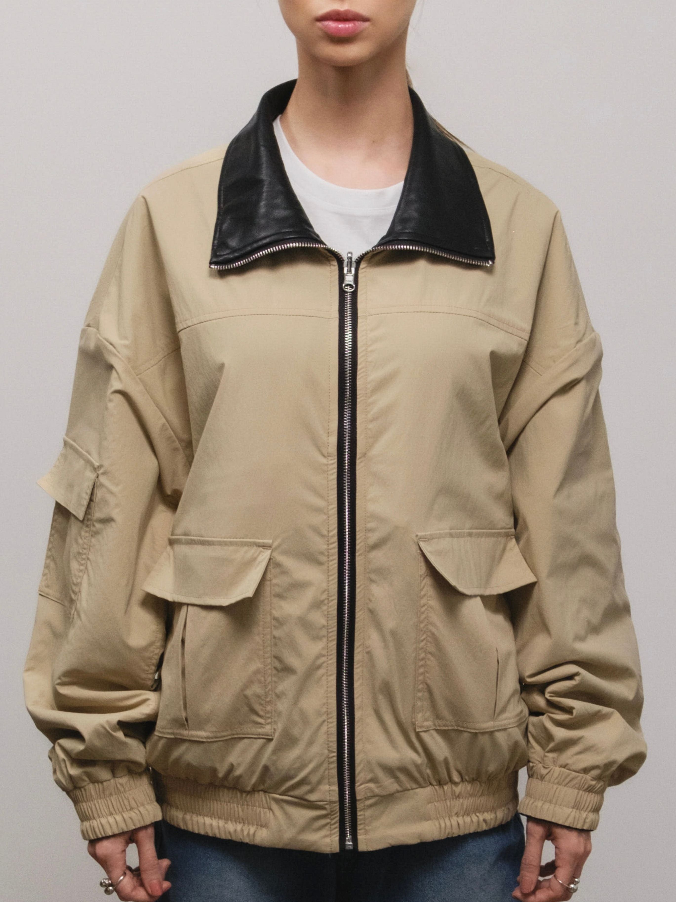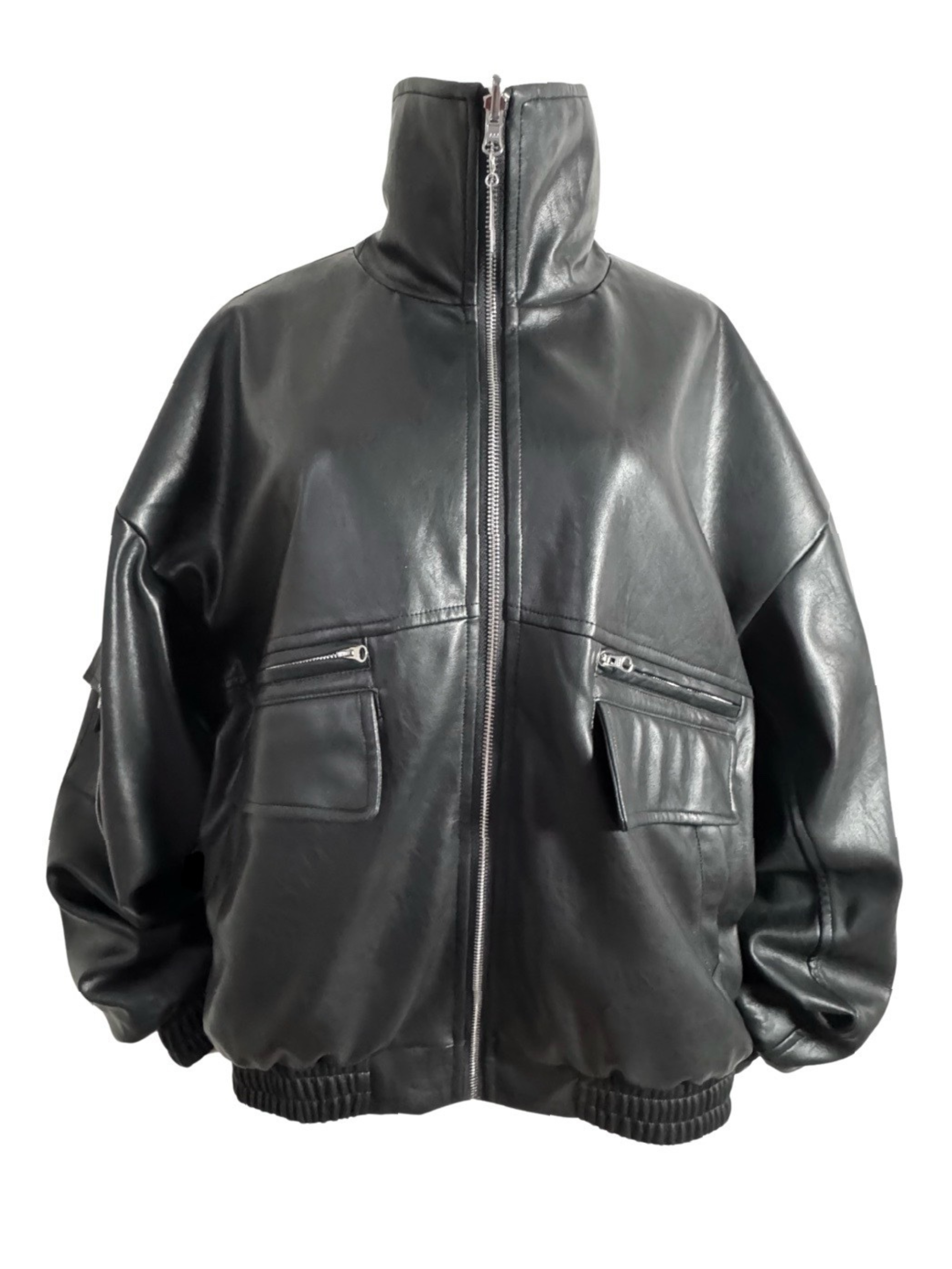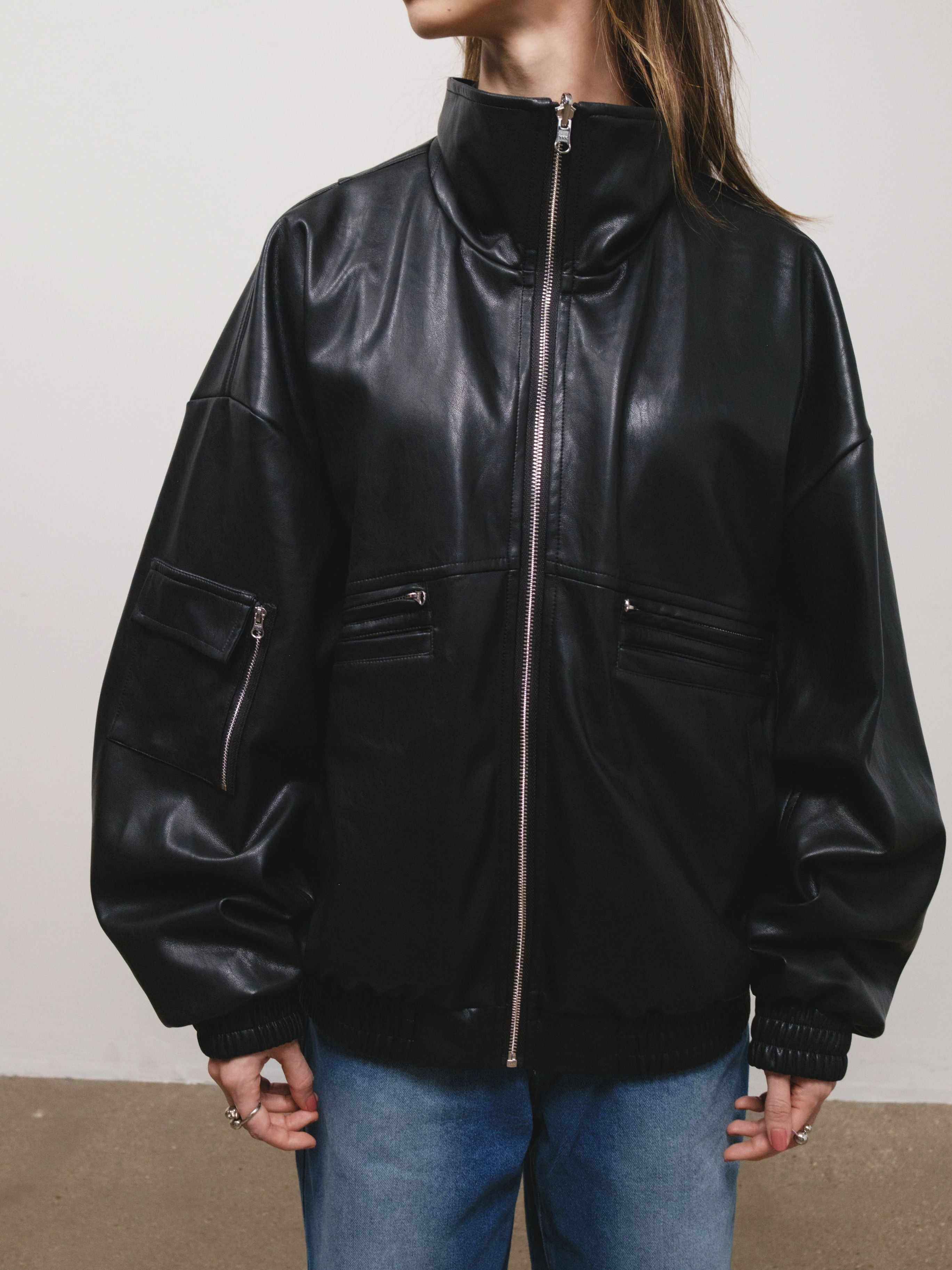 A reversible faux leather and nylon jacket designed to shift with you. One side offers a soft-touch faux leather for a bold, structured look; the reverse reveals sleek nylon for a softer, effortless feel. Both sides are finished with an adjustable funnel neck that styles high, relaxed, or undone—transforming with your mood and your moment.
